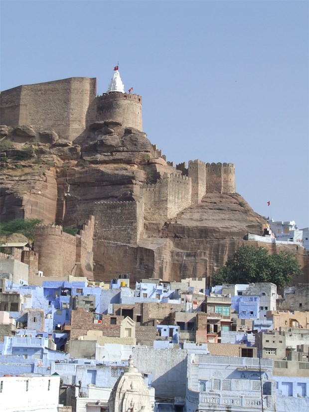 Toda a cidade é vigiada pela fortaleza de Mehrangarh, que se ergue, imponente, na Montanha dos Pássaros. Palco há mais de seis séculos da vida quotidiana de marajás, limita-se hoje em dia a receber os inúmeros turistas que acorrem para ver os seus magnífi cos palácios e templos. As paredes transpiram história. E sangue. Ou não tivesse sido este um importante ponto nas rotas do comércio do ópio, seda, especiarias e pedras preciosas.