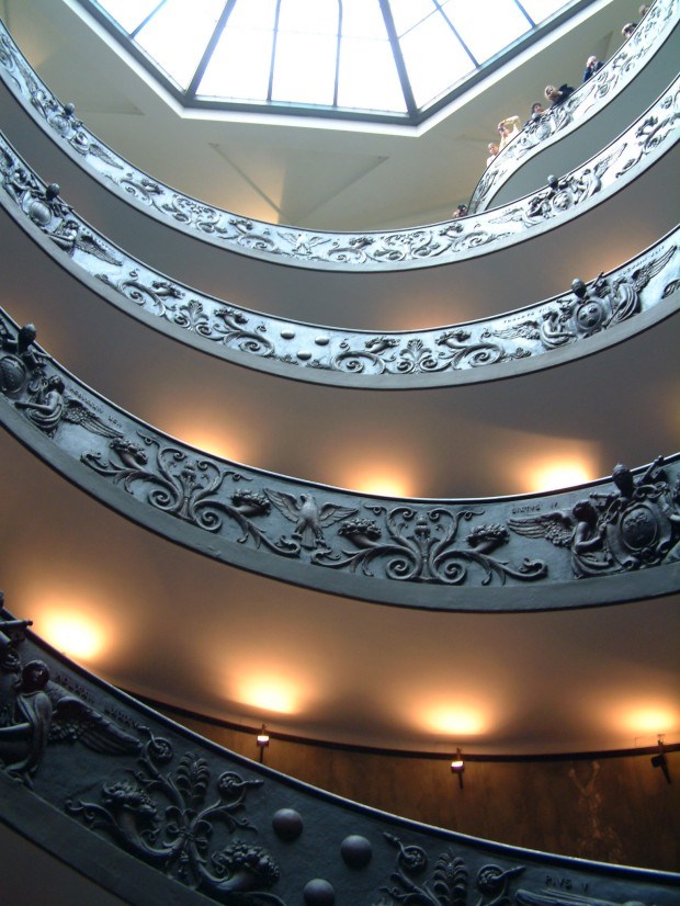 Saio do templo. Tomo o elevador até ao terceiro andar para depois subir ainda 320 degraus até à cúpula. A magnífica simetria da colunata de Bernini pode ser convenientemente apreciada daqui: o rio ao fundo, os Museus do Vaticano vistos do alto, as villas dispersas entre o verde. A omnipresente multidão, numa onda luminosa de flashes e ao som dos zooms automáticos, procura encontrar o melhor ângulo para fotografá-lo, atravancando o pequeno corredor da cúpula.