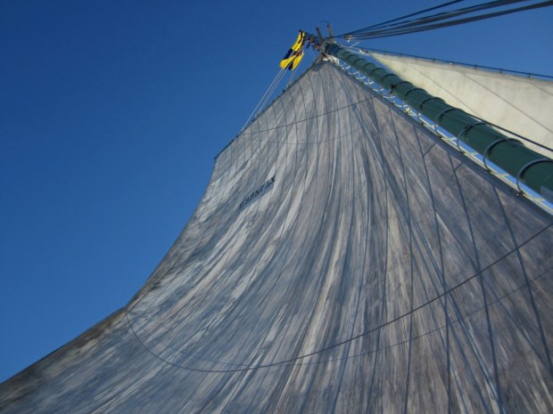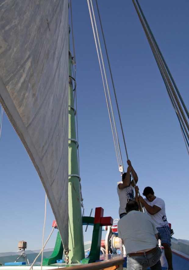 O mestre da embarcação informou que, como o vento estava fraco, ia ter que ligar o motor. Mas não era por isso que as velas não iriam subir. Subiriam, pois. Porque o varino fica mais vaidoso com elas içadas, porque sempre davam alguma sombra e porque ainda havia esperança de que aquela brisa amena permitisse dar descanso ao motor.