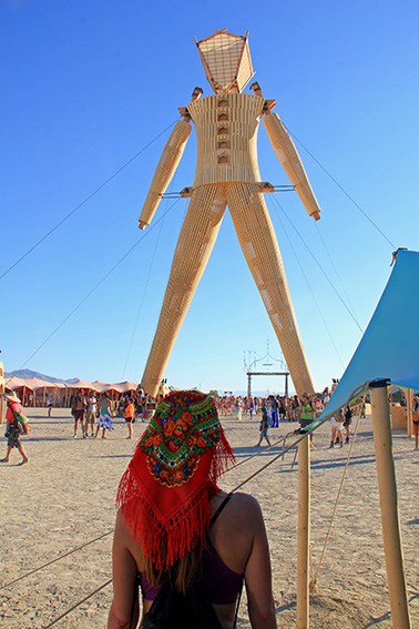 Chegar ao deserto do Nevada é uma verdadeira aventura. São longas as filas de automóveis e autocaravanas, há quem espere muitas horas para entrar. Finalmente avisto a estátua The Man, que se distingue como marco de presença humana naquele lugar inóspito. À entrada há um ritual de boas vindas aos virgins, aqueles que pela primeira vez chegam à terra encantada.