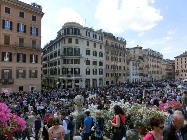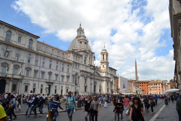 Os olhos tornam-se gulosos e a fome aperta e dita que se compre um copo de fruta por 3€. Continuamos, e finalmente abre-se do canto de uma rua o lado sul da Piazza Navona. O centro é ocupado pela famosa Fontana dei Quattro Fiumi e por vendedores de pinturas de preços exagerados. A caminho das outras tantas coisas por ver, o estômago de quem não comeu revolta-se, e desta vez compram-se fatias de pizza dobradas que nem sanduíches que se comem enquanto se anda. Passamos a Piazza Colonna em direcção à Fontana di Trevi e, ainda antes de entrarmos na praça, amontoam-se pessoas nas esquinas das ruas. Os olhos perdem-se nos pormenores e reparam nas pessoas que atiram moedas na procura de desejos por cumprir. Avançamos para a Piazza di Spagna, que também se abre no meio dos edifícios com ainda mais pessoas. Parece que as gentes nasceram do chão enquanto percorríamos as ruas. Aproveitamos para nos sentar.Recuperamos forças e subimos então as escadas para depois caminharmos pela Viale Trinità dei Monti e nos deslumbrarmos com uma paisagem fantástica dos telhados de Roma. Seguem-se os jardins da Villa Borghese e a sombra que finalmente dá descanso à pele, e estendemos os corpos pelos jardins para aproveitar o momento.