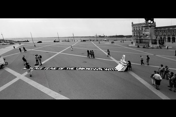 Lisboa. Praça do Comércio. Maio 2011. Actuação onírica com piano e faixa onde se lê Substitui o medo do desconhecido por..