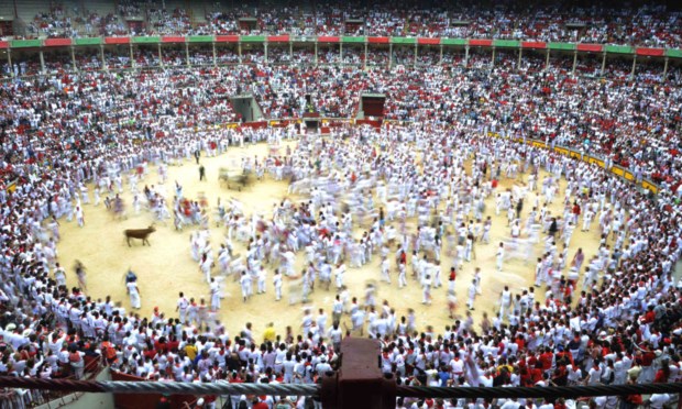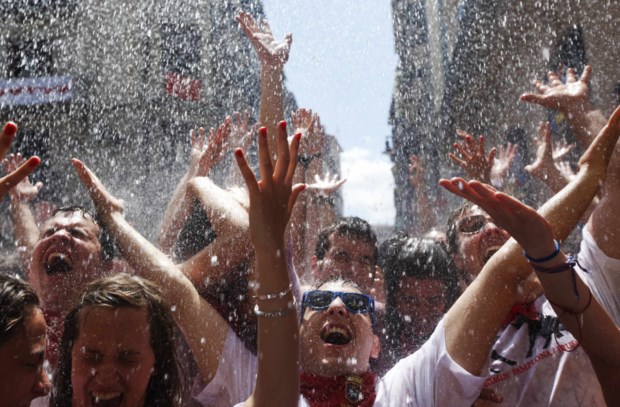 Participantes são molhados durante o “Chupinazo” – o tradicional lançamento de foguetes que marca o início do festival de San Fermin, que foi no dia 6 de Julho Susana Vera/Reuters