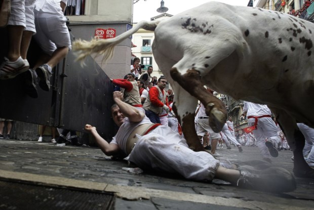Uma vaca selvagem persegue os participantes na praça de touros após a primeira largada de 2011 Vincent West/ Reuters