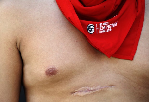 O chileno Alonso Ceardi - que foi gravemente ferido durante uma corrida de touros no festival em 2010 - posa com o típico lenço vermelho de San Fermin. Alonso Ceardi quase morreu quando um touro de meia tonelada lhe deu uma cornada no peito. Mas mesmo assim regressou a Pamplona este ano para participar no festival Eloy Alonso/ Reuters