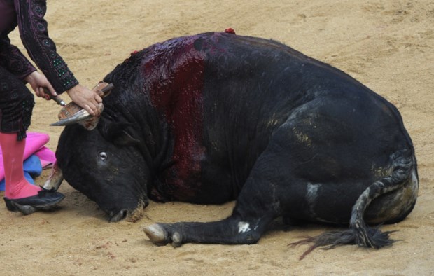 Um toureiro termina a corrida com a morte do touro durante a segunda tourada do festival Vincent West/ Reuters