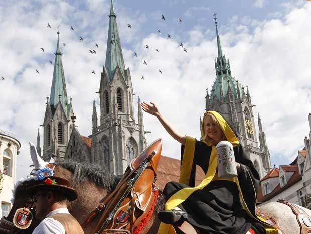 A rainha da festa é a jovem Maria Newrzella, tornada Mauenchner Kindl (personagem que é símbolo da cidade), a imagem viva da festa. Michaela Rehle/Reuters