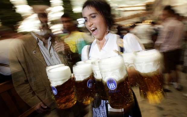Uma arte: bem contadas, esta empregada leva oito canecas, portanto oito litros, de cerveja. Kai Pfaffenbach/Reuters