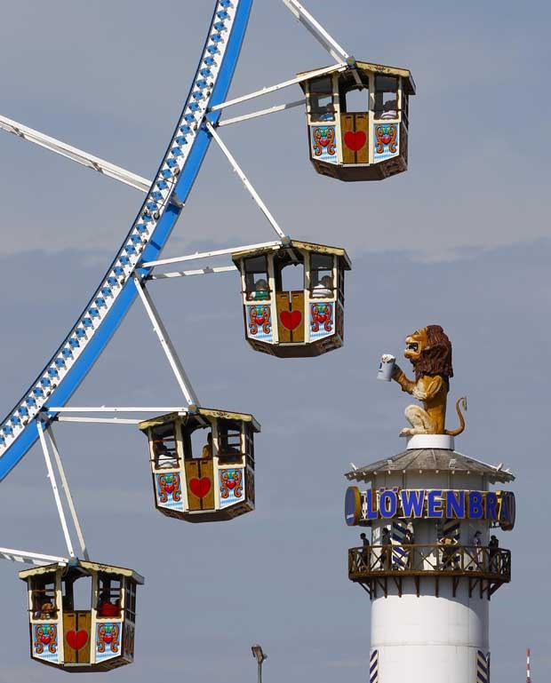 Às voltas na roda, no primeiro dia da festa, sob a benção de um leão a que não falta a sua própria cerveja. Michael Dalder/Reuters