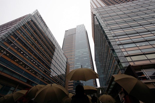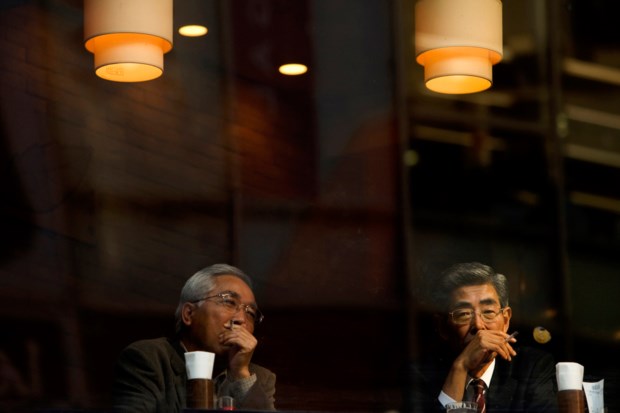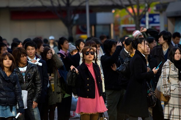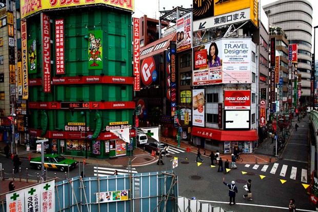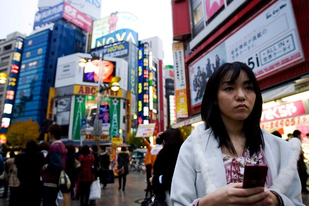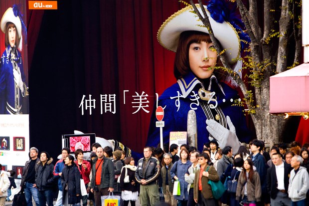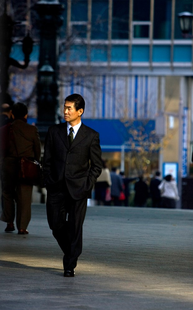 Dois executivos na zona de Roppongi, um dos bairros mais exclusivos da cidade, numa pausa para um cigarro. É proibido fumar nas ruas em Tóquio, no exterior apenas em zonas devidamente sinalizadas e com cinzeiros. E de preferência com um ecrã gigante em frente a passar publicidade. Paulo Barata