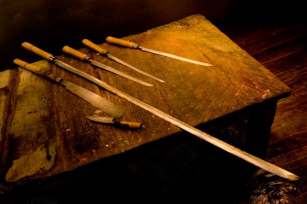 O mercado de peixe de Tsukiji, o maior do mundo. Facas de corte de peixe, sendo a maior para corte específico do atum. Paulo Barata