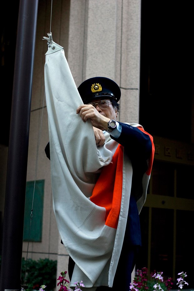 Um polícia hasteia a bandeira num edifício governamental. Paulo Barata