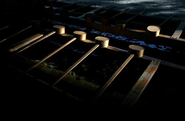 Entrada do templo Meiji, onde os visitantes usam estes utensílios para tirarem água e lavarem as mãos antes de entrarem. Paulo Barata