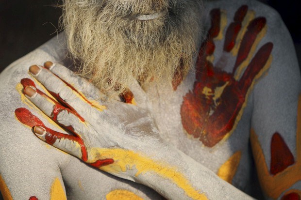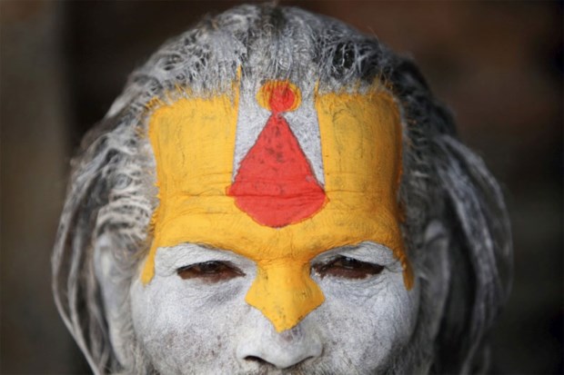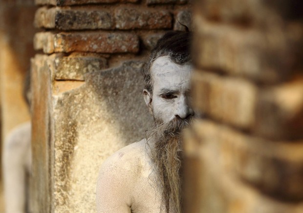 Um “homem santo” do hinduísmo no templo Pashupati, em Katmandu, em preparação para o Shivaratri, o maior dos festivais hindus dedicados a Shiva. Fumar marijuana, rezar e pintar os corpos com cinzas faz parte dos rituais. Fevereiro/2011.