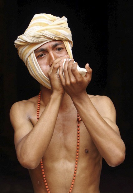 Um homem representando o deus Madhavnarayan sopra uma concha em Thecho, perto de Katmandu, durante o Madhav Narayan Mela, festival dedicado a Madhavnarayan e à deusa Swasthani. Inclui récitas de lendas populares e milagres.