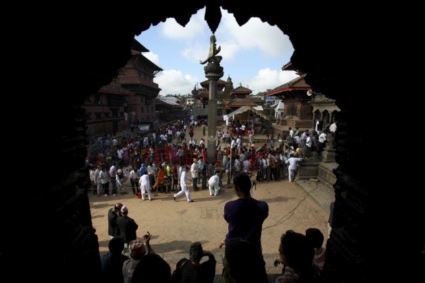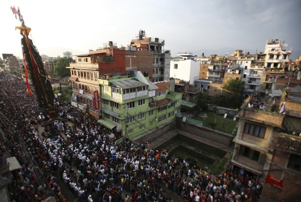 O carro triunfal de Machindranath é puxada pelas ruas de Lalitpur. Maio, 2011. Durante todo o mês do festival pede-se chuva e colheitas abundantes.