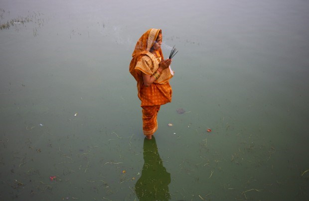 Uma devota aguarda pelo nascer do sol para as suas preces no último dia do festival Chhat, em Katmandu, em honra do deus sol.