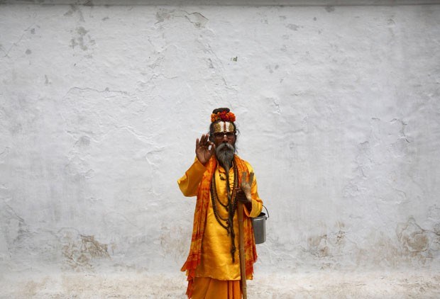 Um Sadhu, “homem santo” hindu, posa para a fotografia durante o festival de Indra Jatra.