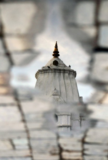 Um temple reflectido numa poça após noite de chuva em Katmandu. Março, 2011.