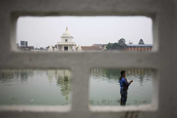 Um crente aguarda o nascer do sol para realizar as suas orações no último dia do festival Chhat, festival hindu, em Katmandu.