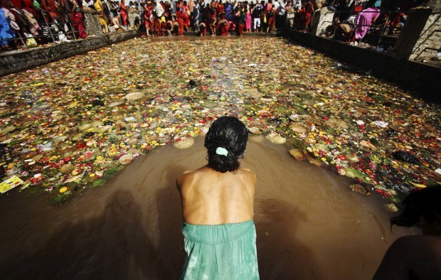 Uma devota prepara-se para o mergulho sagrado no Matathirtha no Dia das Mães em Katmandu. Maio, 2011