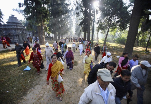 Devotos caminham em redor do templo Pashupatinath em Katmandu. Novembro, 2011.