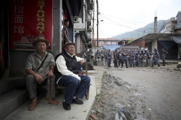 Dois exilados tibetanos, à porta de uma escola tibetana em Katmandu, com agentes da polícia ao fundo. Objectivo: impedir a celebração do aniversário do líder espiritual do Tibete, o Dalai Lama (a 6 de Julho), receando protestos anti-China.