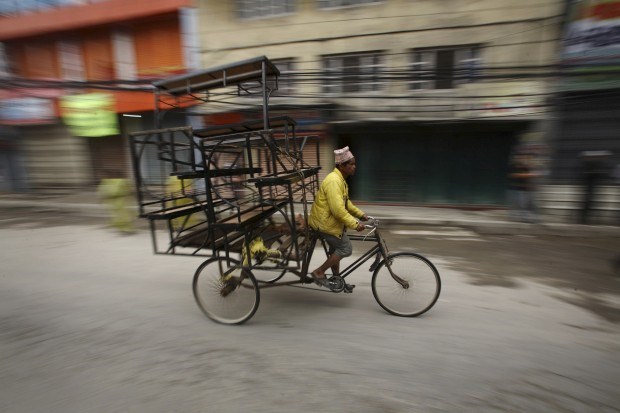 Um homem transporta mercadorias em Katmandu.