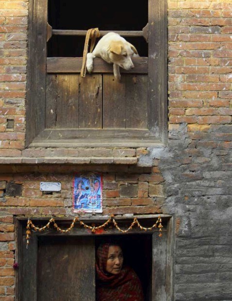 Um cão e a sua dona espreitam de casa. Na velha cidade de Bhaktapur.