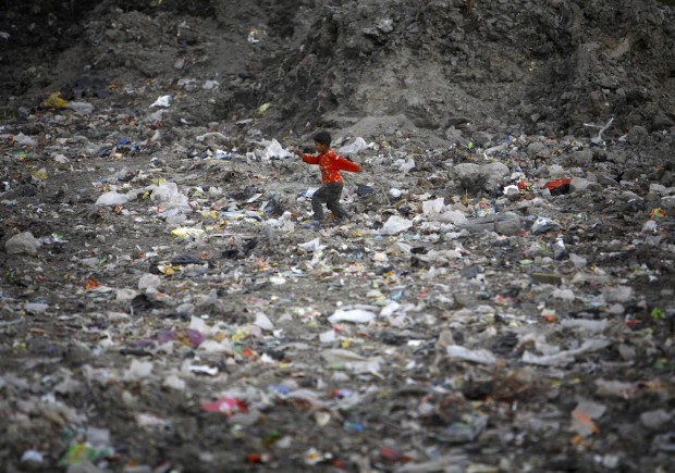 Uma criança brinca numa lixeira, na margem do rio Bagmati, em Katmandu. Novembro, 2011.
