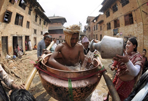Uma crente oferece água a um homem que representa o deus Madhavnarayan, em Thecho, perto de Katmandu, durante o Madhav Narayan Mela. Fevereiro, 2011.