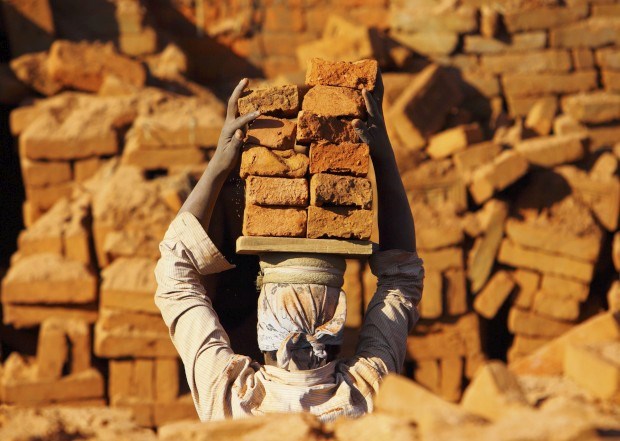 Carregar tijolos na cabeça, numa fábrica em Bhaktapur.