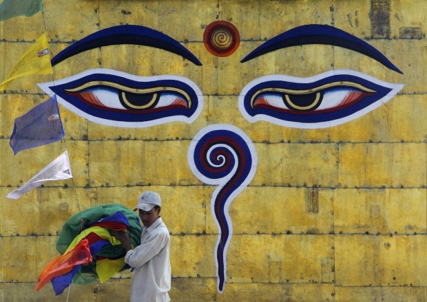 Um devoto do budismo transporta uma velha bandeira religiosa destinada a ser substituída por uma nova. No complexo de templos Swayambhunath Stupa, em Katmandu.