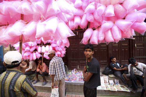 Um vendedor de algodão doce aguarda os clients durante o festival Krishna Janmashtami (celebra o nascimento de Krishna), em Lalitpur, perto de Katmandu. Agosto, 2011.