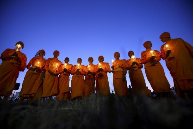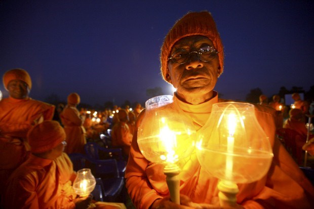 Monges nepaleses e as suas velas durante o evento Juntos pela Paz Mundial, organizado pela Associação Interrnacional Dhammadayada, em Katmandu. Novembro, 2011.