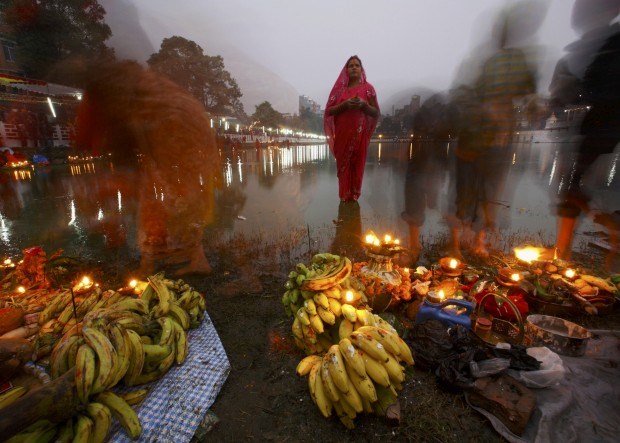 Uma devota aguarda pelo nascer do sol para as suas preces no último dia do festival Chhat, em Katmandu, em honra do deus sol. Novembro, 2011