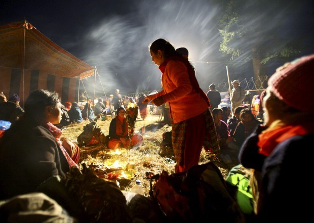 Devotos do festival Bala Chaturdashi, onde os crentes espalham sete tipos de grãos, os "sat biu", em honra dos falecidos. Novembro, 2011.
