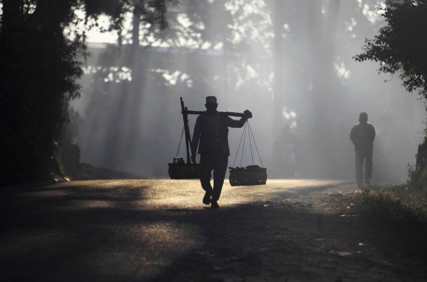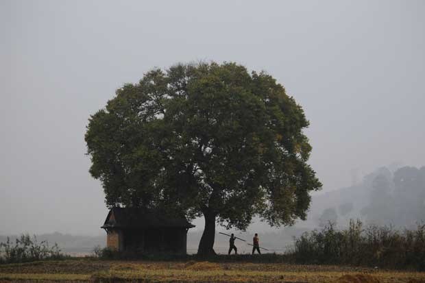 Um agricultor nepalês caminha para o seu campo ao amanhecer. Em Bhaktapur. Novembro, 2011.