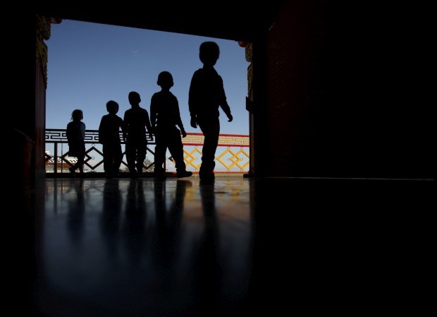 Jovens estudantes entram no mosteiro Thrangu Tashi Yangtse durante uma visita de estudo em Kavre, perto de Katmandu. Novembro, 2011.