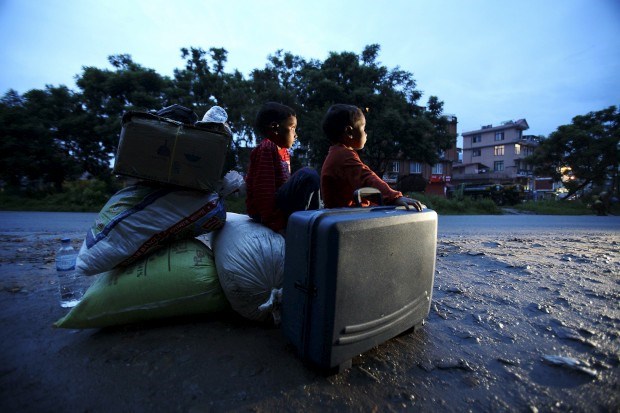 Sentados sobre a sua bagagem enquanto aguardam pelo início da viagem. Em Lalitpur. Agosto, 2011.