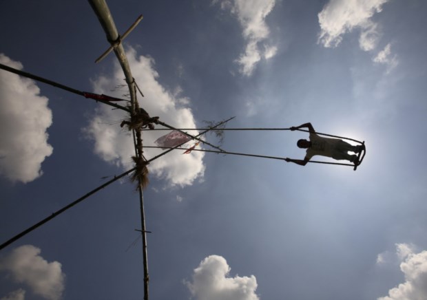 Um jovem brinca num baloiço durante o festival hindu de Dasain, em Katmandu. Celebra-se a vitória do bem sobre o mal. Setembro, 2011.