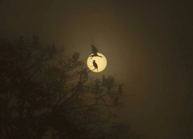 Corvos-marinhos na sua árvore enquanto o sol se ergue sobre os pântanos de Taudaha, Katmandu.