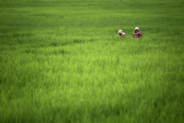 A trabalhar num arrozal na aldeia de Khokana, a sul de Katmandu.