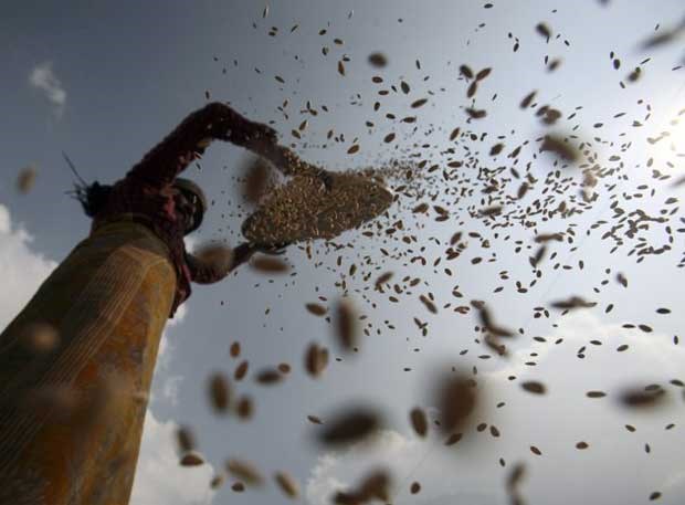 Uma camponesa peneira cereais em Bhaktapur.