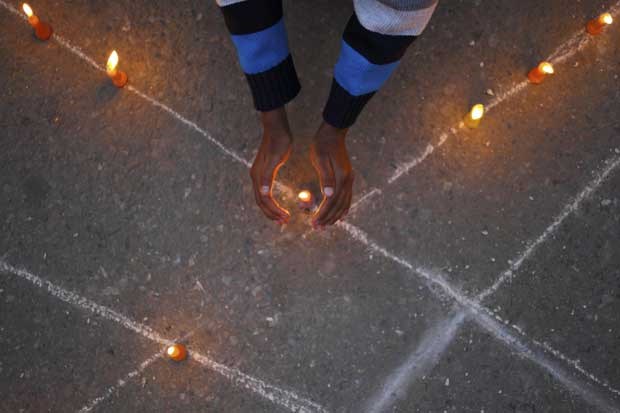 Um jovem tenta proteger a chama de uma vela durante uma cerimónia que marca o dia mundial da luta contra a sida. Novembro, 2011.