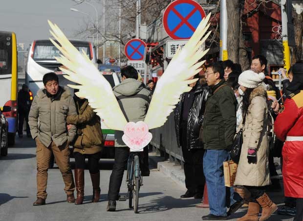 CHINA. Um ciclista com asas de anjo, perto do templo tibetano Lama em Pequim Mark Ralston/AFP