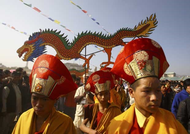 NEPAL. Monges participam na parada de Sonam Lhosar, que marca o novo ano lunar para o grupo étnico Tamang. Em Katmandu Navesh Chitrakar/Reuters