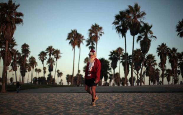 Por que se passeava este Pai Natal no último Agosto na Venice Beach de LA? Boa pergunta. Lucy Nicholson/Reuters