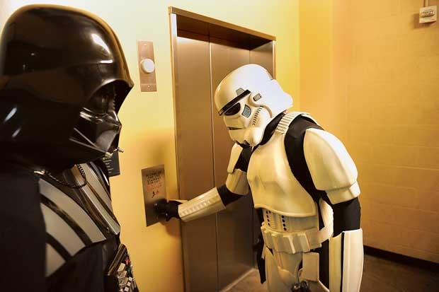 Já de outro tempo, outra dimensão, parecem chegar estes dois personagens de Star Wars, fotografados enquanto aguardam o elevador no Kodak Theatre Wally Skalij/LA Times/MCT