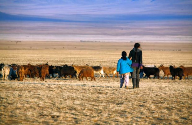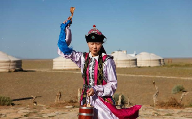 Preservar as tradições também para mostrar ao turista: Uma rapariga realliza uma velha cerimónia de despedida, atirando arroz aos turistas, num campo em Bayanzag, Omnogovi Laurence Tan/Reuters